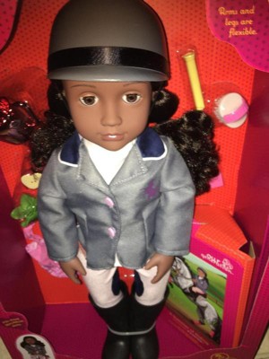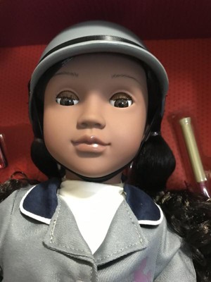 - Includes: Posable 18-inch doll, a top, formal jacket, necktie, pair of riding pants, pair of undies, tall riding boots, helmet, polo-style shirt, riding crop, horse caddy, grooming brush, horse scraper, storybook and bookmark.