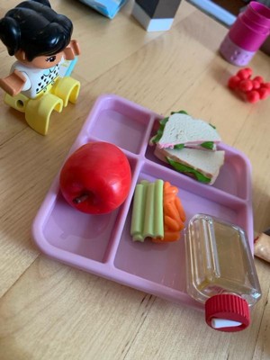 - Includes: A storage case, food tray, cafeteria card, set of veggie sticks, 2 sandwich halves, cereal bar, apple, bottle of juice, carton of milk, a container with tomatoes, a container with cheese, bag of pretzels, a thermos, a spork, a lunch bag and 3 sheets of stickers.