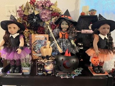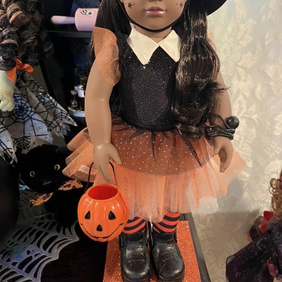 - Spooktacular Style: Just like those who dress up in their favorite costumes, Selene stands out as a whimsical witch featuring a sparkly hat, bat-winged shoes, a spider bracelet, and a pumpkin treat bucket—all beautifully accented in orange and black!