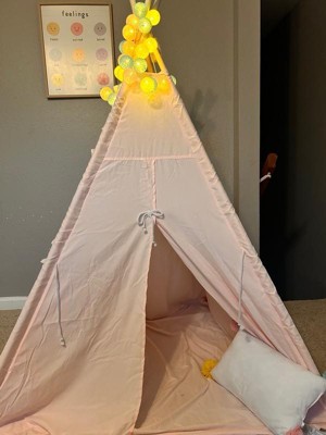 - Includes: Pink play tent, 16 wooden tent poles, 12 connectors, a pillow, a string of globe lights, and an anti-collapse kit.