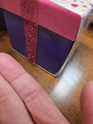 Hi ello - Thank you for your feedback. We aren't sure what happened to the Our Generation Surprise Decoration Gift Box you received, but it shouldn't have been covered in glitter. As you can see from the images online, each box is decorated with glittery ribbon, but there are no loose pieces of glitter. We hope that your little one enjoyed the contents of the mystery ornament. Maybe you would consider posting a review on the contents! We would love to hear what you think! Sincerely, Team Battat