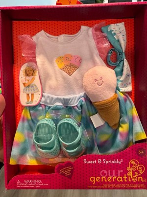 - 18-inch Doll Ice Cream Outfit: Explore fun styles in scoop-tacular fashion with the Our Generation Sweet & Sprinkly outfit for 18-inch dolls!