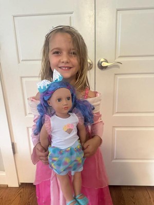 Explore fun styles in scoop-tacular fashion with the Our Generation Sweet & Sprinkly outfit! This 18-inch doll clothing set includes an ice cream-print top with a rainbow-style skirt and shoes for a complete look. Plus, it comes with cute accessories like a large bow headband and an ice cream plush! When it's time for dress-up, this 18-inch doll outfit has easy-open closures to quickly put on and remove. So kids can mix, match, and create more sweet looks as they explore imagination and self-expression. Our Generation 18-inch doll clothes make a great gift for kids ages 3+ (small parts), encouraging them to create their own unique stories. Compatible with most 18-inch dolls, doll clothes, and accessories. Our Generation dolls sold separately.