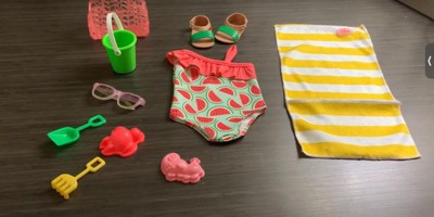 Our Generation Slice of Fun swimsuit outfit for 18-inch dolls! This colorful watermelon - print swimsuit with cute ruffled neckline is the perfect outfit for your dolls to wear as they enjoy playing on the beach. A pair of trendy two - tone sandals complete the outfit and are perfect for a stroll down the boardwalk. Use the convenient plastic beach tote bag to carry your striped yellow and white beach towel and any other beach essentials you plan to bring. The [plastic bucket, rake, shovel, and sand molds will give your dolls hours of sandy fun. Will they build a castle, or just dig a super - deep hole? It's all up to you and your imagination! The doll in the pictures is Ginger. (Dolls sold separately, available at Target. Compatible with American Girl dolls.)