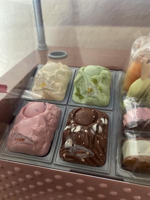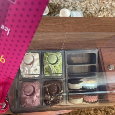 - Includes: pink ice cream cart, 4 ice cream blocks with 4 scoops of removable ice cream, 4 cones, 4 ice cream cookie sandwiches, 6 ice cream bars, 3 bowls, 3 spoons, 2 bottles of syrup, scooper, cone tray, and napkin dispenser.