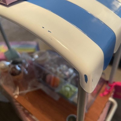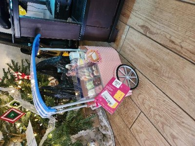 As the item is a Christmas gift it has not been “opened”! It looks like such fun with one’s doll friends!! BUT, WHEN I PICKED UP THIS ITEM AT THE TOPSHAM, MAINE STORE I SOON DISCOVERED, ONCE HOME, 11/2 hour away, THAT THE PAINT ON THE TOP/CANOPY WAS SCRAPED OFF!!!! At this time of year and with supplies limited I have decided to keep it and add flowered stickers to cover TARGET’S MISHANDLING!!! I am very unhappy!!
