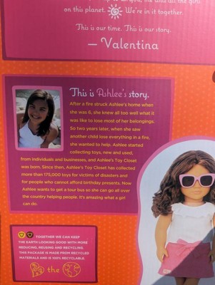 [This review was collected as part of a promotion.] The doll is very beautiful, the beautiful brown eyes with lids that close, and the eyelashes are a great touch. I gave this doll to my niece, and I was surprised by the quality. The packaging is simple, I liked Ashley's story on the back. It was heart touching. I would say it is worth the money and would make any little kid happy. The doll is quite tall.