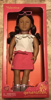 [This review was collected as part of a promotion.] Thank you so much to Influenster and Our Generation for allowing us to play with the Glam Fashion Doll Valentina in exchange for a fair and honest review. This is an 18" tall hard plastic still doll that blinks (with head position) and includes a top, a skirt, undies, boots and sunglasses. She stands up easily (even on carpet) and her limbs move easily. I absolutely love the philosophy of the company / doll; the back of the box has a wonderful paragraph that describes "Valentina's philosophy" (if you will), including the inspiring line: "With our brains and passion and oodles of determination, we're making things happen." (with "our" and "we" referencing the generation of the child playing with the doll) Because of this, I feel as though this doll is best geared toward children aged 5-10 - however, in my case, my littlest little (almost 3) decided SHE was quite in love with this "baby" and insisted that it was hers. She has been obsessed with "baby" ever since (the past week), so certainly even younger children that like dolls will love this one, I just think the story / background / philosophy is best geared toward children a tad older. My only small qualm was we found that the sunglasses don't stay on super well (ie, they fall off relatively easily), but this isn't the end of the world and they can be adjusted to mostly stay on. Overall, definitely a recommend!