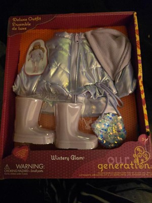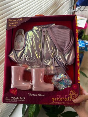 Bundle up in brrr-illiant style with the Our Generation Wintery Glam outfit! This 18-inch doll clothing set includes a metallic puffer coat that kids can really zip up. Plus, the coat has cute ruffle details for extra playful charm. The adorable beanie hat and tall pink boots make dress-up double delightful for fashion lovers as they style their doll from head to toe. And for adventures on the go, they can carry their favorite mini items in the heart-shaped sequin purse! Compatible with most 18-inch dolls, doll clothes, and accessories to mix, match, and set new trends. Our Generation doll clothes are a great gift for kids ages 3+ (small parts), encouraging them to create their own unique stories. Our Generation dolls sold separately.