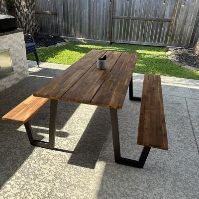 - Patio Dining Table Set: Our outdoor dining table set comes with dining table and two benches. The dining table measures 70" (L) x 30" (W) x 30" (H) and each bench 70" (L) x 10" (W) x 18" (H).