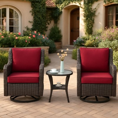 Upgrade your outdoor space with this 3-piece wicker bistro set featuring two 360¡ã swivel rocking chairs and a tempered glass table. Enjoy smooth rotation and gentle rocking motion, ideal for relaxing in the sun or chatting with friends. The chairs are crafted with hand-woven, all-weather PE rattan over a sturdy steel frame, while thick, high-density cushions provide luxurious comfort. The dual-layer glass table offers scratch-resistant durability and extra storage, making it both stylish and practical for any patio, deck, or garden.