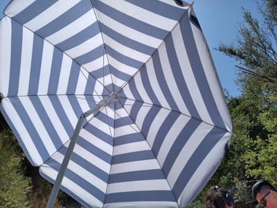 [This review was collected as part of a promotion.] I love, love, love my new beach umbrella. The blue and white striped design is so pretty. We have its sitting in a very hot area of my front gardens. Two overstuffed chairs, a table and this lovely umbrella shading us perfectly. This umbrella covers us with over 5 feet of cooling shade. We can tilt so we get just the coverage we need to stay cooler in our often 113 degree days. It comes with its own carry sack. So bringing it to the beach is never a problem.. and during the winter, we just clean it and place it that handy sack. Waiting the next years Spring. It is very easy to keep clean. Also, it is easy to put into the ground. We simply carefully began pushing it slowly in an area of wet soil and within 3 or 4 minutes it was firmly set and easy to use! We have used portable shade umbrellas before, but it was such a bother to set up, they ended up in the attic. I give it a 10 for ease of assembly and for its stable mounting. So good looks, ease of use and the ability to take it with us, make this a real winner! I confidently recommend this product!
