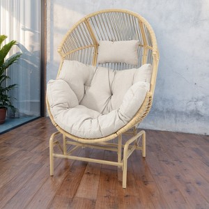 The glider egg chair's modern design and versatile nature mean it can be used in a variety of settings, from residential homes to commercial spaces such as cafes or hotels, making it a highly versatile and functional piece of furniture. About this item COZY EGG CHAIR- Our glider egg chair outdoor offers a super soft cloudy cushion. It's padded with high quantity cotton which embrace you from all sides. Best company as an egg chair with legs when u back from work to enjoy inner peace. HAND-WOVEN PE RATTAN DESIGN- outdoor egg chair with stand made of PE hand-woven rattan, interlocking fashion rattan modern style, waterproof and UV resistant while embellishing your home. HIGH-QUALITY FRAME MATERIAL- The egg chair lounger is made of sprayed iron pipe and PE rattan winding to prevent rusting and coating off, sturdy and stable. HOW TO INSTALL- TIPS: Hardware and detailed manual are provided to help set up wicker egg chair within 60 minutes. And all cushion covers are removable for easy cleaning and different looks. Great lounge chairs for outside. NOT JUST FOR OUTDOORS - The glider egg chairs are truly modern additions for outdoors like garden, porch, patio, pool etc., and they also add an laid-back bohemian grace to your living room, dining room and bedroom. Features: Soft Cushion Enjoy reading, coffee or a nap in this lounge chair with its comfortable soft pillows and thick cushions. Sturdy Alloy Steel Frame The chair frame is made of alloy steel, which can hold up to 400 lbs. and offers a high quality product. Beautiful outlook Suitable for both indoor and outdoor settings, the double egg chair creates a cozy ambiance on a patio, garden, or balcony, allowing couples or friends to connect with nature What's in the box? 1* Glider Egg chair with cushion 1* All hardware and manual