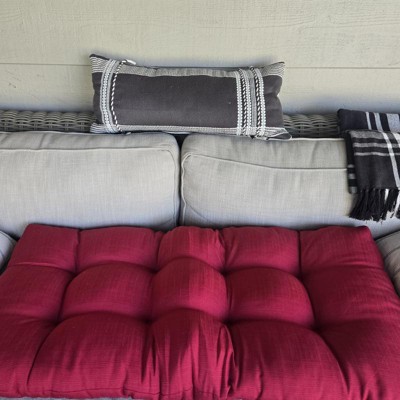 [This review was collected as part of a promotion.] I purchased this cushion online. The first thing I thought when it arrived is that the color is a little off from the online photo shown. I thought it would be more of a rust color, but it actually looks more of a red in person. So right away I knew it probably wouldn't work in my backyard. I wanted to use this with an existing bench/love seat i have. Unfortunately for me, it was a little bit too small. It's about 44" long, but i needed it to be a little bit longer. The depth of 19" was perfect. It's comfortable and soft and has just the right amount of stuffing. The tufts are made well and is think this should hold up. I am wondering if the color will fade in the sun though and how it will hold up outside. I did buy it during a promotion and it was an incredible deal! I received an incentive to write this review.