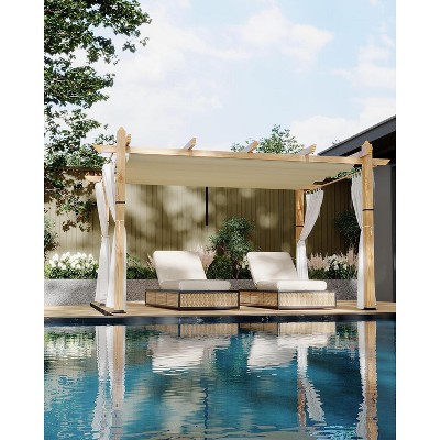 Outdoor Retractable Pergola with Canopy and Side Mesh Screen, Upgraded Wood-Grain Post Aluminum Pergola, for Backyard, Patio, Beige+White