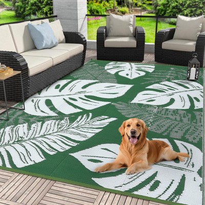 Outdoor Rugs 9x12 UV Resistant Waterproof Patio Rug, Plastic Straw Reversible Portable Rug Modern Carpet for Beach Balcony Deck Yard, Green/White