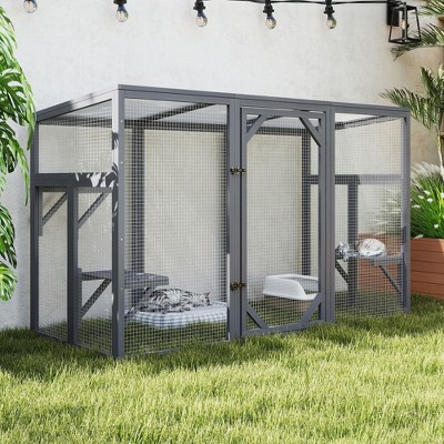 Outdoor Wooden Catio Cat Enclosure – 60" Large Feral Cat House with Platforms, Grey