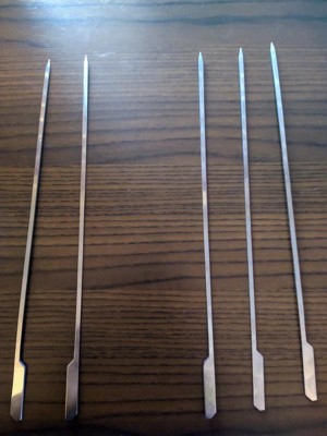 [This review was collected as part of a promotion.] The "OUTSET" paddle skewers are nicely finished stainless steel skewers. The set of 12 skewers come in a well made canvas storage pouch with a Velcro closure and convenient hanging loop. Each individual skewer is 12 inches long with a 10 inch business end and 2 inch handle. The skewers are flat with a sharp point for piercing food. I was concerned that being flat the skewer would be too flexible, but they are beefy enough and do not flex very much at all, even when piercing thick or difficult food. The point is sharp enough to penetrate most foods easily yet not destroy or tear smaller morsels. I was able to easily pierce Pork, Beef, shrimp, peppers, onions and even the small salad tomatoes. But what I really like about the skewers, is that by being flat, they have excellent holding ability. food does not "spin" or slip around like is often common on your typical round skewers. The handle portion of the skewer, although the same thickness as the rest of the skewer, it widens out from 1/4 inch wide to a full 5/8 inch wide by 2 inch long "paddle". I found this wide enough to allow you to handle the skewer and turn it for even cooking, but I have large fingers and I would prefer a little more width. The skewers are dishwasher safe and being stainless steel, clean up nicely.