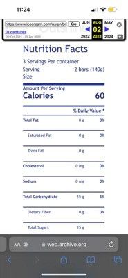 I eat the grape Popsicles every day, but they have changed and do not taste like grape anymore!! They are very artificial tasting and leave a nasty aftertaste in your mouth. The packaging is different to from the box to the interior wrapping. The popsicle also is also much softer.. I would have given a five star review for the old recipe but this new recipe doesn't even deserve a single star. Please go back to the original recipe!!