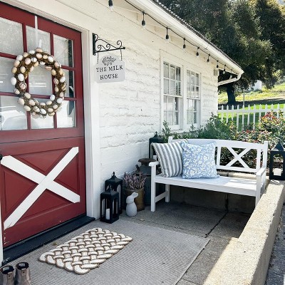 I searched high and low for the perfect outdoor bench. I have had this one for just under a year and has held up great! I feel that you get the best deal for great quality. I love the satin finish, was easy to build, and feels very sturdy. Plus it looks so stinking cute by my front door!