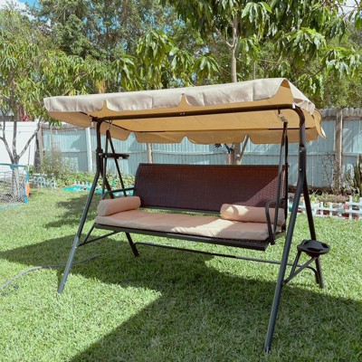 Outsunny 3-Seat Porch Swing with Canopy, Outdoor Swing Chair with Removable Cushion, Pillows, Adjustable Shade, and Rattan Seat