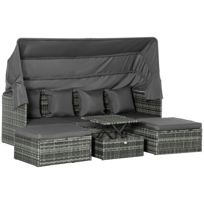 Our five-piece rattan patio sectional set brings the comforts of the living room to the backyard. Everything is there: a couch composed of two corners and a center section, an ottoman footrest, and a tempered glass table. Enjoy perks like throw pillows, thickly padded cushions, and a place to put your feet up in the great outdoors. Offering a home base for outdoor activities, it easily becomes the icing on top of pool parties, picnics, and backyard barbeques. Get out, get comfy, get Outsunny.