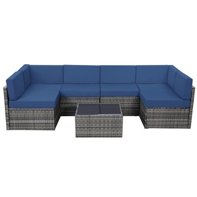 Outsunny 7-Piece Patio Furniture Sets PE Rattan Sectional Sofa Set Outdoor Conversation Set w/ Acacia Top Coffee Table & Cushion for Garden, Gray