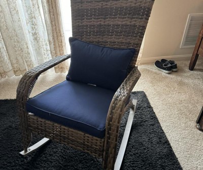 Outsunny Outdoor Wicker Adirondack Rocking Chair, Patio Rattan Rocker Chair with High Back, Seat Cushion and Pillow for Porch, Balcony, Dark Blue