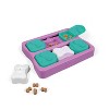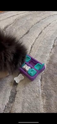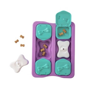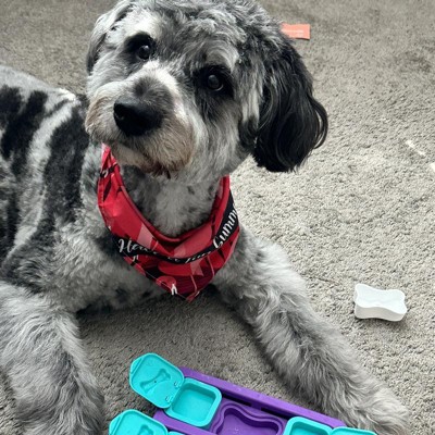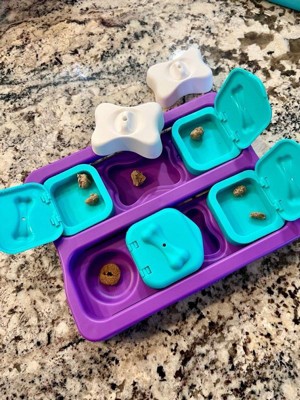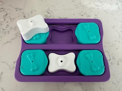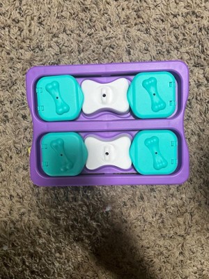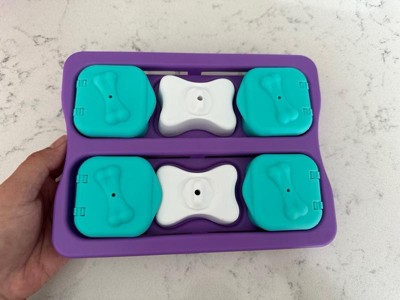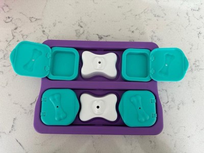 Flip, slide and treat! With 10 hidden treat compartment, your dog has to flip over lids and remove bones to uncover treats. The doors slide back and forth to hide even more treat compartments and requires dogs to exercise their brains with three distinct and unique actions. Helps reduce destructive behaviors by exercising your dogs mind. 15 minuntes of mental stimulation is the equivalent of 30 minutes of physical exercise, keeping dogs happy & healthy at the same time. Fights boredom and provides mental stimulation dogs need. Fun for all dogs, regardless of age, size or breed. Each layer separates and is easy to clean and is dishwasher safe. Made with food safe materials, BPA, PVC and phthalate free. The non-slip feet holds the puzzle in place during use.
