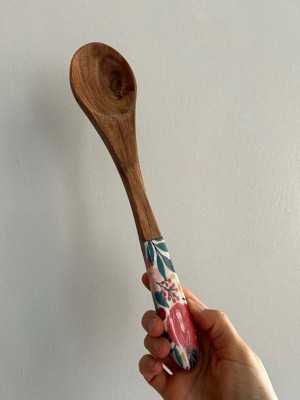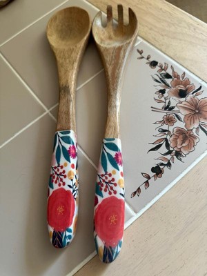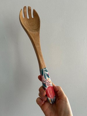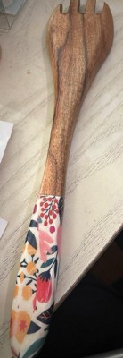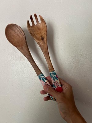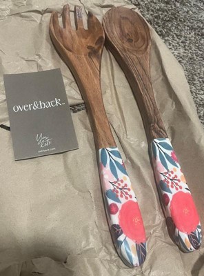 over&back Jess Phoenix Acacia Wood Enamel Finish Serving Utensils: 12" Brown Multicolored Fork & Spoon Set, 2 Pieces