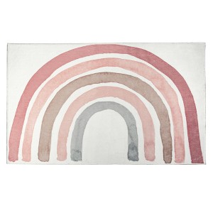 The Rainbow rug by Levtex Baby is a soft pile polyester rug. This rug features fun, colorful, dramatic large scale rainbow in shades of pink, on a rich cream ground and will complement so many design choices. Sized at 5 x 7 (60in. X 84in.), this rug is the perfect size for a small room, or as an accent piece.