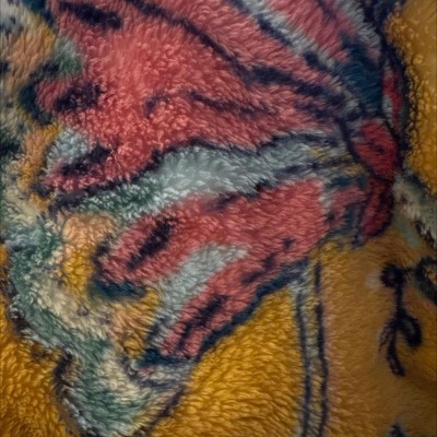 A great buy! This large and oversized throw has a pretty orangy-gold background with colorful flowers on vines. It has ultra soft velour on one side and a slightly muted color with a soft furry texture on the other. This throw is warm as it has a substantial weight for a throw but not too heavy! Washes beautifully with very little fluff left in the lint catcher of my dryer. I have purchased three and may buy another. I would purchase the matching throw pillow if it goes on sale. Perfect for anyone who likes to stay comfortably warm!