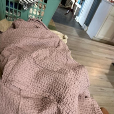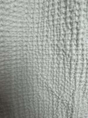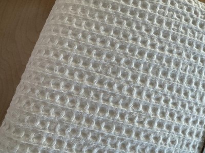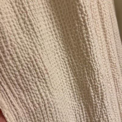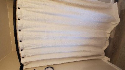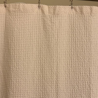 A: The shower curtain is made from 100% cotton with a waffle-weave texture.
