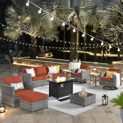 Marlton 10pc Wicker Outdoor Fire Pit Patio Furniture Set Conversation Sofa with Swivel Chairs and Cushions