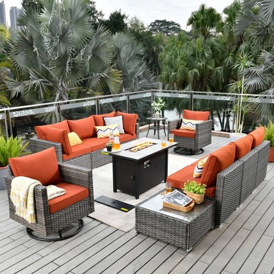 Ovios Venice 6pc Wicker Outdoor Patio Furniture Set Conversation Sofa with a Metal Fire Pit and Black Cushions