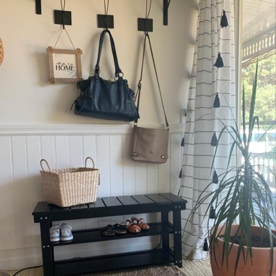 This bench is very poorly made. If I wasn’t too lazy to repack all the parts, I would have returned it. I did get 25% off original price which is why I’m giving it one star and keeping it. It was fairly easy to assemble though. When I opened it, 2 of the top slats already came off. I used some wood glue to repair it myself. And the black paint was missing on the edges and corners. Not scratched, just not painted well. It is a very flimsy bench and wont fit full length of shoes unless you’re only using for kids shoes. Afraid to sit on it as it may not hold up a full sized adult.