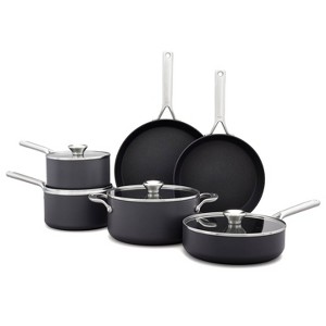 Get more room and better performance with the OXO Ceramic Professional Non-Stick 10-Piece Cookware Set. Each of these pots and pans features a diamond-reinforced ceramic non-stick coating that delivers effortless food release with less oil. Cleanup is easy, plus our ceramic non-stick coating is free of PFAS, PFOA, lead and cadmium. This collection’s scratch-resistant, hard-anodized aluminum bodies heat faster and more evenly than traditional aluminum, and the thoughtfully designed shape means up to 35% more room to cook in each frypan. Plus, the tempered glass lids let you keep an eye on your meal without losing heat. Optimized for any kitchen, this set has heavy-duty induction bases that works on every stovetop and they’re dishwasher safe.