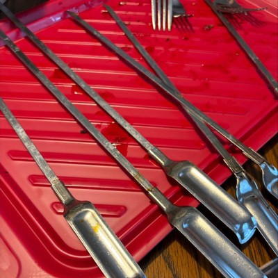 The OXO SoftWorks 6-Piece Grilling Skewer Set is the ideal companion for grilling up tasty kabobs all summer long. Made of sturdy stainless steel, these skewers hold plenty of savory ingredients over your grill's open flame. Savory cubes of meat, sliced veggies and even juicy fruits all slide onto the sharp points with ease, and the flat design keeps your kabobs steady as they cook. When it's time to flip, there's no rolling or spinning to worry about — just perfectly even cooking every time. The skewers feature wide handles with a thumb-sized divot that makes it comfortable to grasp, even as you apply pressure to slide the finished food onto the plate. The flat design also allows you to safely grip the skewers with tongs when they're hot. Handles nest together for neat, space-saving storage when not in use. Dishwasher safe for easy cleanup.