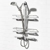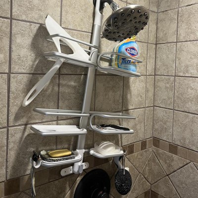 The OXO Aluminum Hose Keeper Shower Caddy keeps any length shower hose neatly out of the way. Our rustproof anodized aluminum Caddy is effortless to set up: The StrongHold hook grasps showerhead pipes securely, and adjustable suction cups provide extra stability. The Caddy has four large-capacity shelves that accommodate large shampoo and conditioner bottles, two soap dishes and four hooks to make sharing a bathroom a whole lot easier. The trays have drainage slots and holes for storing bottles upside down, and they are removable for easy cleaning.