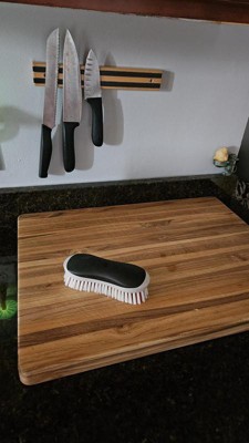 [This review was collected as part of a promotion.] This heavy duty, non-slip grip brush is amazing at cleaning my wood cutting boards. About 1x per week I scrub my granite countertops as well as a variety of kitchen surfaces such as my cutting boards. The brush is easy to hold with rubber gloves and does not have a bad smell after cleaning kitchen grime.