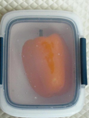 [This review was collected as part of a promotion.] The OXO 3.3 Cup Prep & Go Container has a white plastic bottom and a clear plastic top. The top cover has a removable inner blue seal that is washable. The container’s inner dimensions are about 4.5 (W) x 6 (L) x 2 (H) inches. On the longer sides of the cover, there are two side clasps, that are relatively easy to close. It does not have two clasps on the top and bottom, shorter sides of the cover of the product. The cover’s blue seal fits into the opening of the bottom container, to make the tight seal, rather than fitting over the entire bottom part of the container and covering it. When filled with water, drops of liquid leaked out of the container, when placed on its side or shaken. The water seemed to leak out of the rounded corners and the top and bottom sides of the cover, without the clasps. The capacity is listed as 3.3 cups; 4 C would have been better because it would be easier to put measured amounts into a container with a whole number capacity. It fit one medium bell pepper in it, but compressed the top of it. It is made of BPA-free plastic, but glass, steel, or another, more environmentally friendly material would be more preferable. The product has a “1% for the Planet” label on it, which seems to be an organization that encourages businesses to donate 1% of sales to environmental groups and focus on “issue categories,” such as the environment and pollution. However, since this product is plastic, it is contributing to environmental waste, was well. Overall, this is an adequate product, that is not completely leak-proof to liquids, and is an unusual capacity of 3.3 cups, that useful for storing small amounts of food.