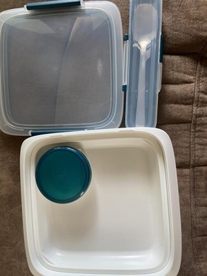 This leakproof salad container from OXO has so many more uses than just a salad! The silicone gasket and two locking clips allowing you to rest assured your contents are safe and leakproof. The salad container also hold a good amount of food with a 6.3 cup capacity. There is a bottom portion, a top tray, and a condiment container making this a 3 piece set. The bottom portion is perfect for salad greens, sandwich bread, or a sandwich. The top tray can easily hold some grilled chicken, sliced or chopped vegetables, sandwich meat, or anything you want to keep separate from the bottom portion. The condiment keeper fits nicely in either the top tray or bottom holding just the right amount. The container is BPA-free and dishwasher safe. The container can also be used in the microwave so that morning oatmeal or hot breakfast/lunch is always ready to be warmed and you don't have to transfer it to another container! I am enjoying being able to separate my lunch salad when I am out and about. This container has made taking food with me better and no more fast food! Taking your lunch, breakfast, dinner or snacks couldn't be any easier than with the OXO Good Grips Prep & Go Leakproof Salad Container.