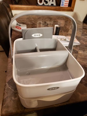 [This review was collected as part of a promotion.] I received this cute plastic diaper caddy from OXO and I must say I love it! It's made very well, the plastic is sturdy and this seems like it will last a long time. It is a nice size and fits a lot of baby things inside, like diapers, wipes, lotion, soap, etc....I am very pleased with this caddy.