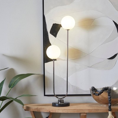 Go modern with this handsome table lamp design from the Pacific Coast Lighting brand. Inspired by Mid-Century design and modern lamps, it features a chrome silver finish metal pole and downbridge arm that has the light and glass hanging offset from the pole. The gray smoke glass element allows you to see the bulb, and provides a sleek style accent. A marble base offers visual interest and a stability.