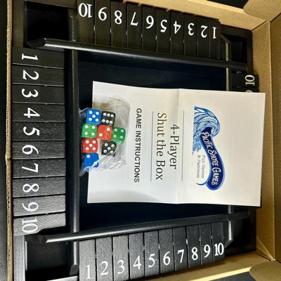 I received a free sample of this game from WE Games. I’ve only ever played a one sided Shut the Box game, this 4 sided one is perfect for playing with 4 people at the same time. Absolutely love how classy the black color is, especially with the silver numbers.