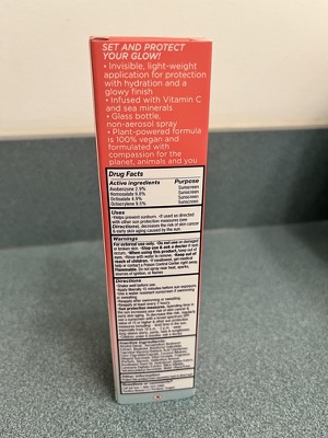 Smells great, not sure about the Skincare ingredients but it works great as an easy SOF top up. I still use a daily SPF, Supergoops Unscreen, but this if a great top up that I like to leave in my bag. I haven’t had an issue with the glass bottle but I think I’m gentle when mixing it and let the ball roll back and forth to because I read reviews of them breaking while shaking. It smells great. The spray isn’t super fine mist but not a full on spray. I especially love it for my ears because those are harder to get spf on. It isn’t super greasy but it does give you that sheen that most SPFs will. It dries down okay and I haven’t had a problem putting it over my makeup.