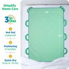 The green quilted top indicates the absorbent side (face up), while the blue waterproof bottom layer sits against the bed. The low-profile handles tuck easily under the mattress when not in use.