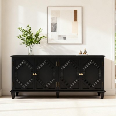 Elevate your space with this retro-inspired sideboard featuring four fluted doors and wave design, blending simplicity with vintage charm. Crafted from durable MDF with retro copper handles, it offers a 220LBS top surface and 50LBS adjustable shelves (three height settings) for diningware, books, or electronics. The cable management holes and soft-closing hinges enhance functionality, while adjustable plastic foot pads ensure stability on any floor. Ideal as a buffet cabinet or kitchen cabinet, this sideboard cabinet combines elegant fluting with practical storage for dining rooms, living areas, or entryways.