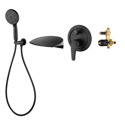 PAGED Shower Faucet Set Wall Mounted Rain Showerhead with Handheld and Waterfall Tub Spout for Bathroom, Matte Black