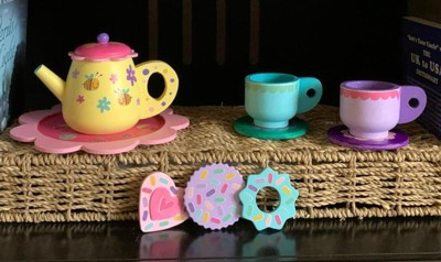 - Features 2 cups, 1 teapot, a plate and stickers